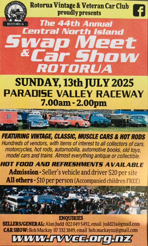 44th Annual Swap Meet hosted by Rotorua Vintage & Veteran Car Club Sunday 13th July 2025 .